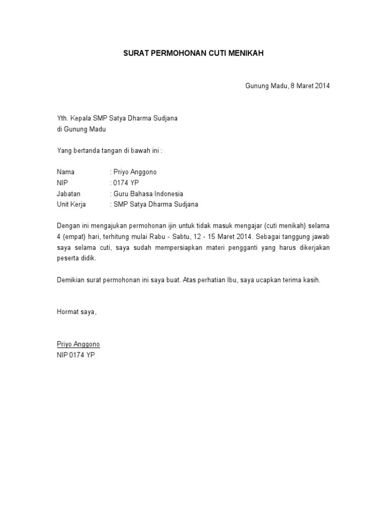 Uncategorized Izin Cuti Menikah Bermaksud untuk mengajukan izin cuti kerja selama 1 satu hari kerja pada tanggal 11 januari 2019 dikarenakan adik kandung saya menikah Anda pun bisa meminta izin cuti menikah kepada kepala sekolah beberapa hari sebelum pernikahan anda dilaksanakan