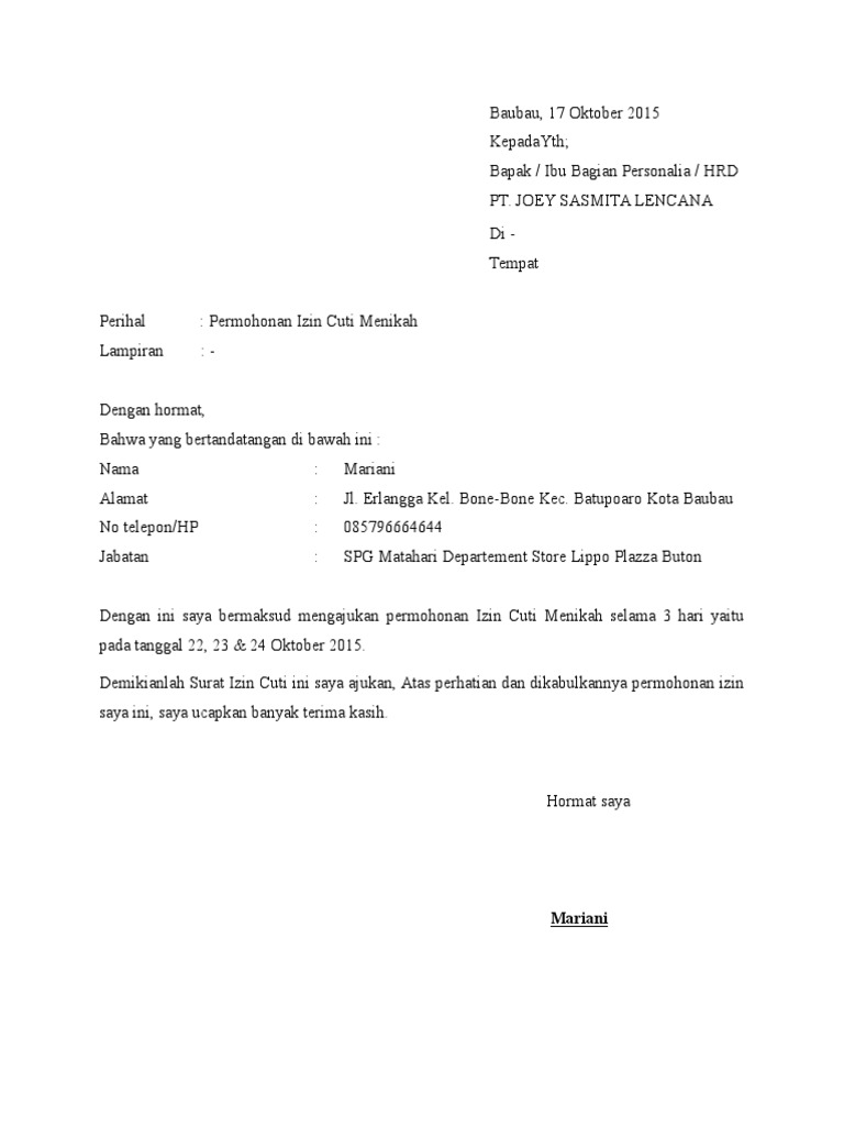 Uncategorized Surat Izin Cuti Menikah Dari Desa Surat cuti merupaka surat yang dibuat sebagai bentuk pemberitahuan permohonan izin ke perusahaan supaya bisa diberikan izin tidak masuk kerja sehingga memberikan kesan baik bagi seorang karyawan terhadap perusahaan Demikian surat permohonan cuti menikah ini saya sampaikan dengan sebenarnya